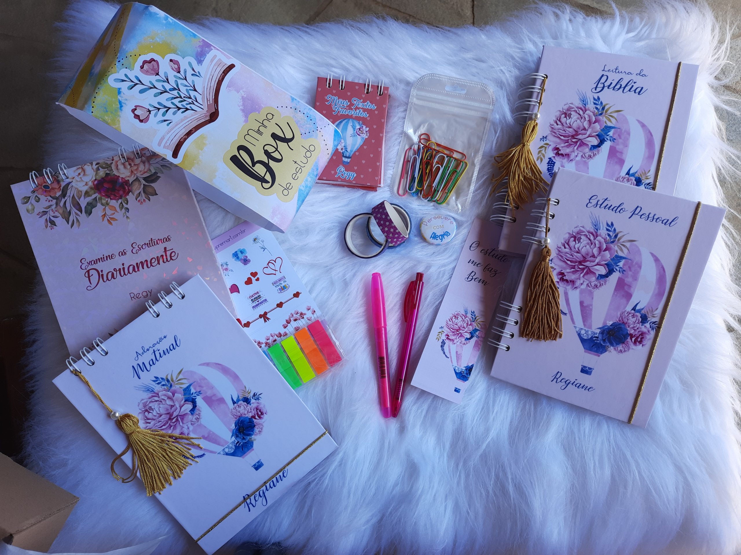 Caixa com 15 ítens, sendo 8 fixos (cadernos, caderneta, botton, marca páginas e adesivos), e os demais podem sofrer alterações de acordo com a disponibilidade (canetas, marca textos, e acessórios)