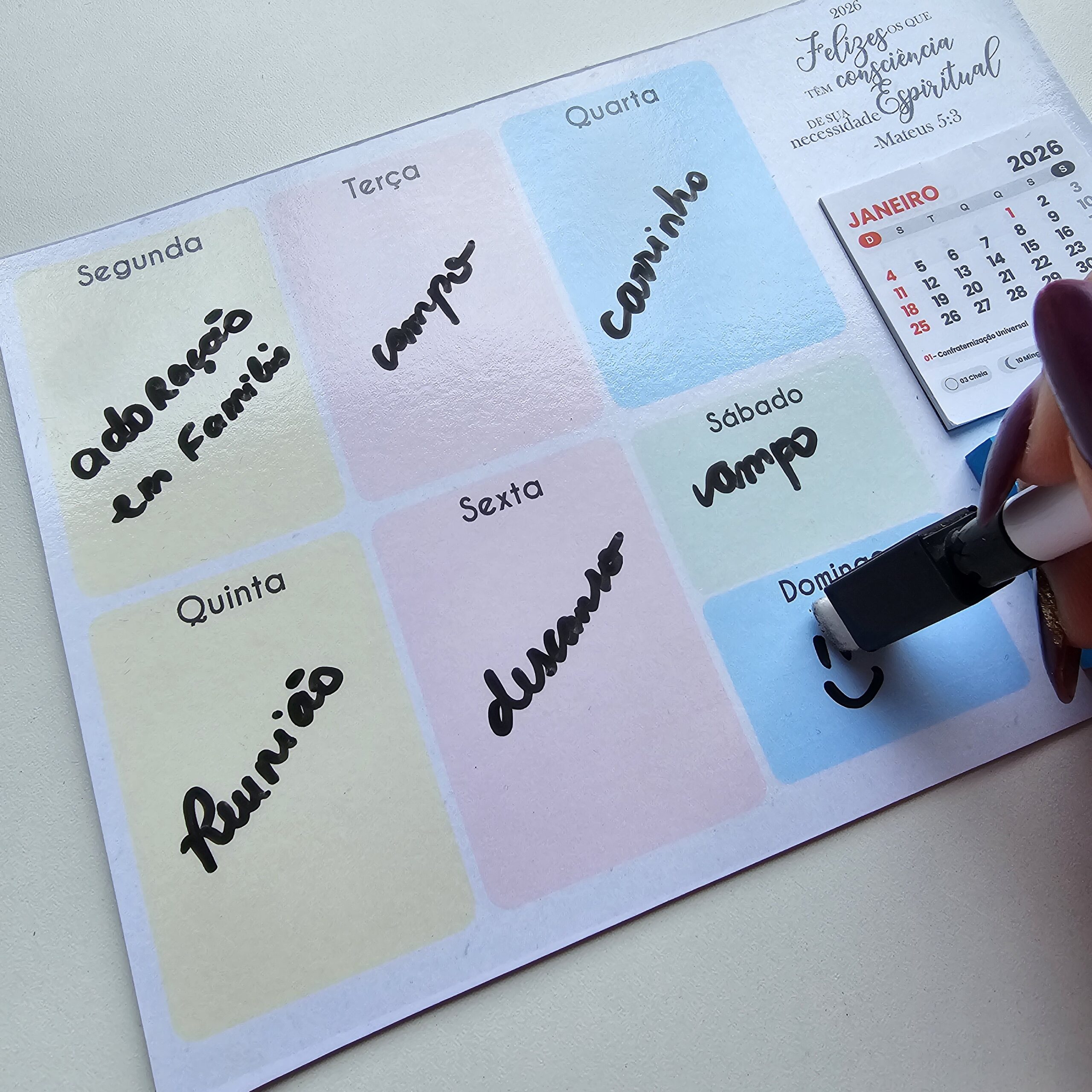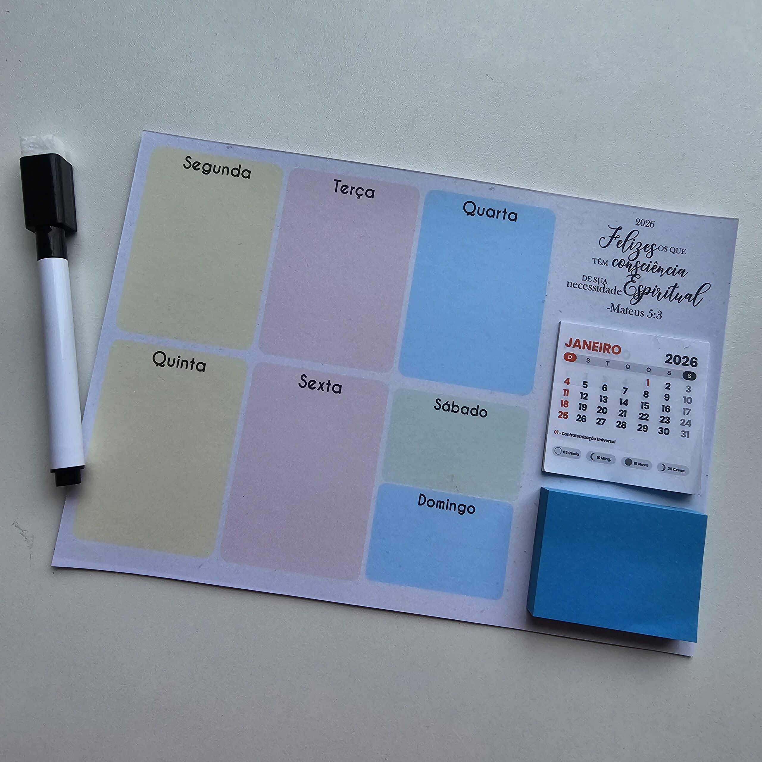 O planejador semanal magnético inclui calendário + bloco post it + caneta apagador com imã